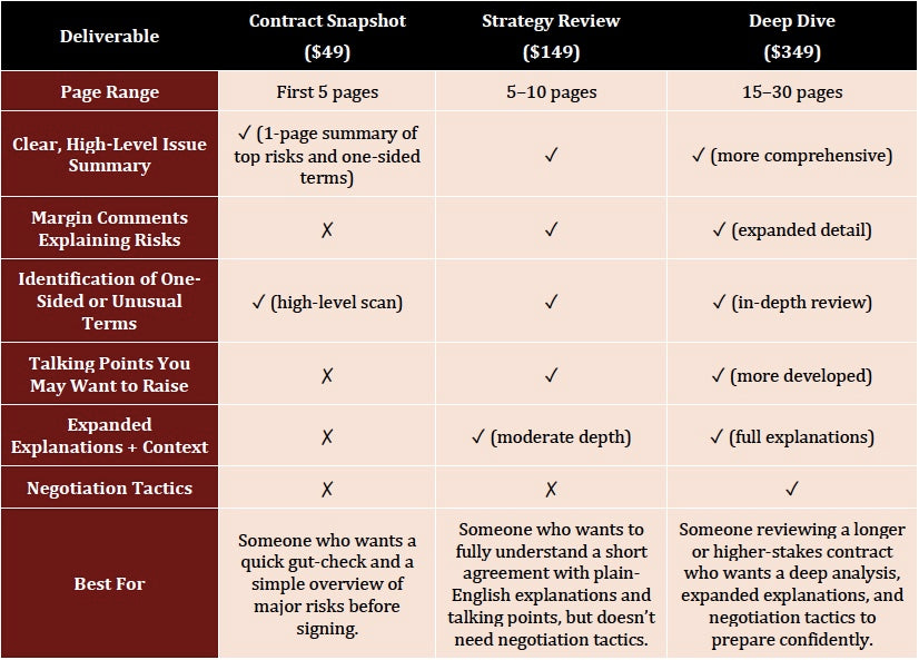 For longer or higher stakes agreements, the Deep Dive delivers the most thorough analysis with expanded explanations and negotiation tactics that help you prepare for discussions confidently.
